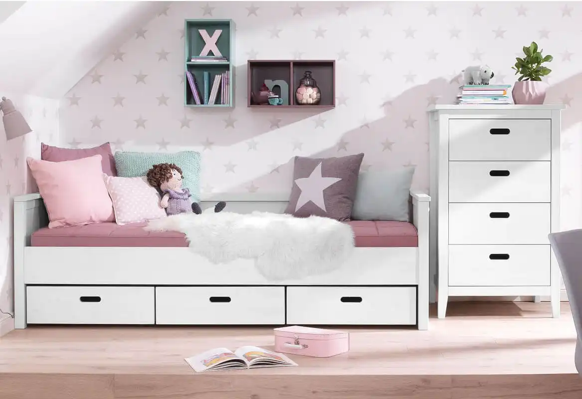 Мебель изготавливается из массива сосны, окрашивается в белый цвет («белый воск»). Ящики устанавливаются на роликовых направляющих. Кровати продаются без ортопедических оснований, решетки для кроватей можно выбрать и купить отдельно на сайте или в фирменных салонах нашей компании.