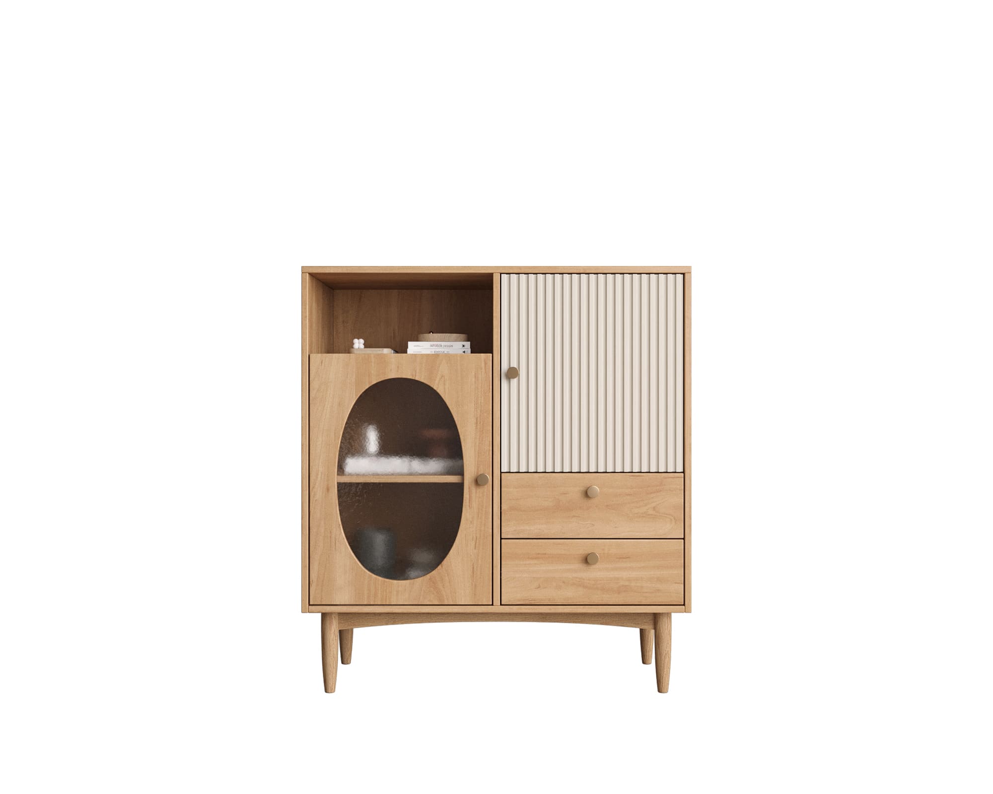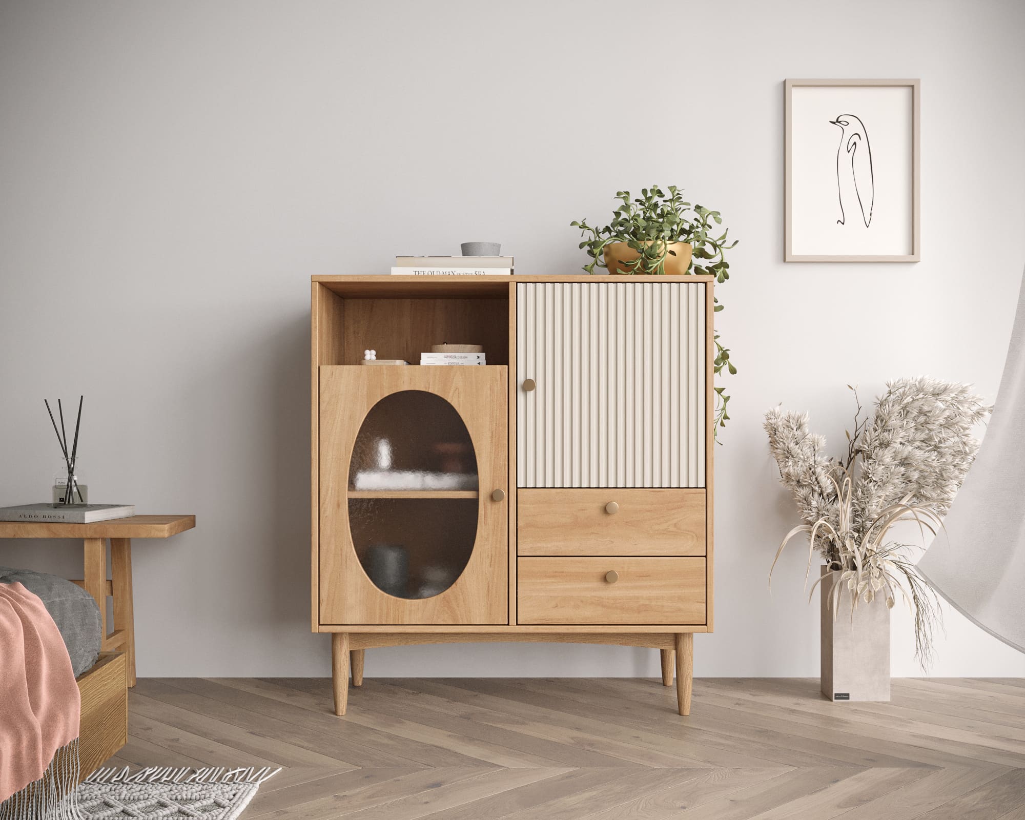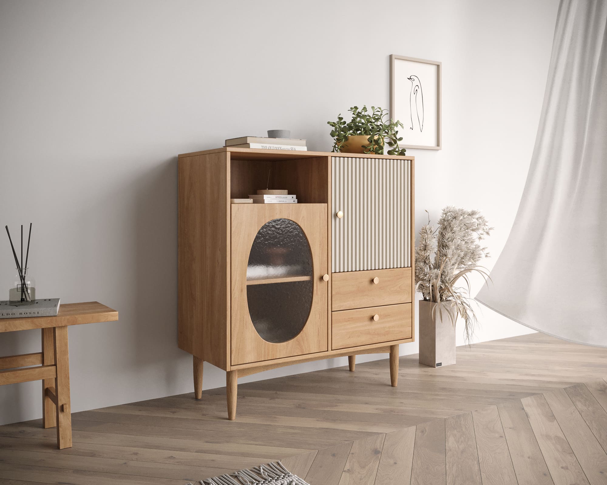 Ножки комода высокие и выполнены из ясеня, что придает ему элегантный и элегантный вид.