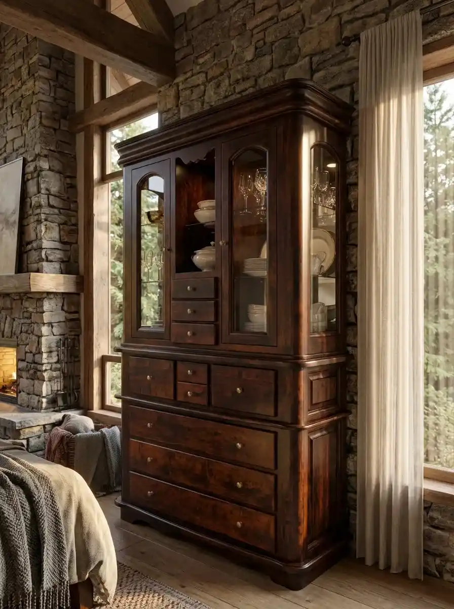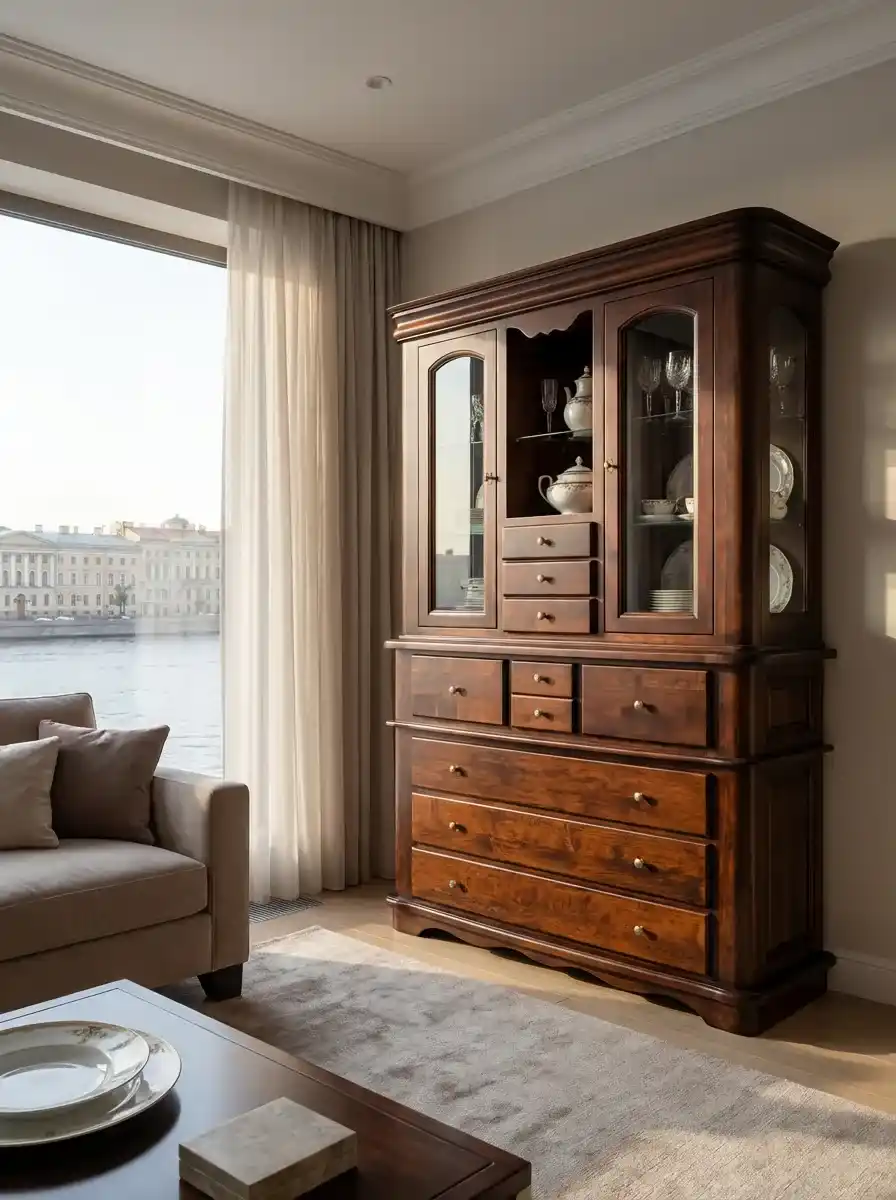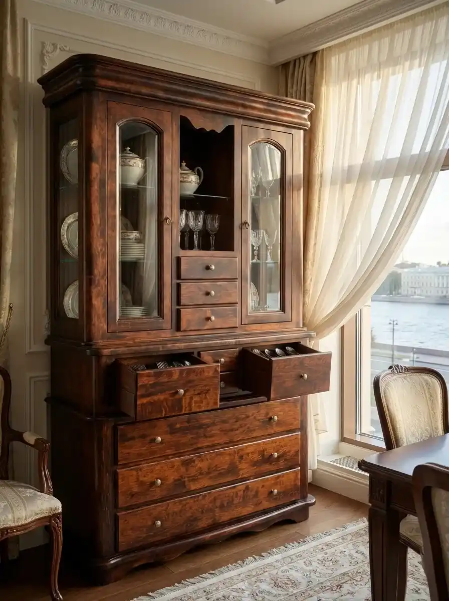 У буфета два отделения с остекленными дверцами, открытая ниша с полками и десять выдвижных ящиков разного размера. На ящиках и дверцах металлические ручки, на дверцы можно установить замки с ключами. Габариты комода (ШхГлхВ) 1250х515х2110 мм, вес 214 кг. Поставляется в разобранном виде. Гарантийный срок – 1 год.