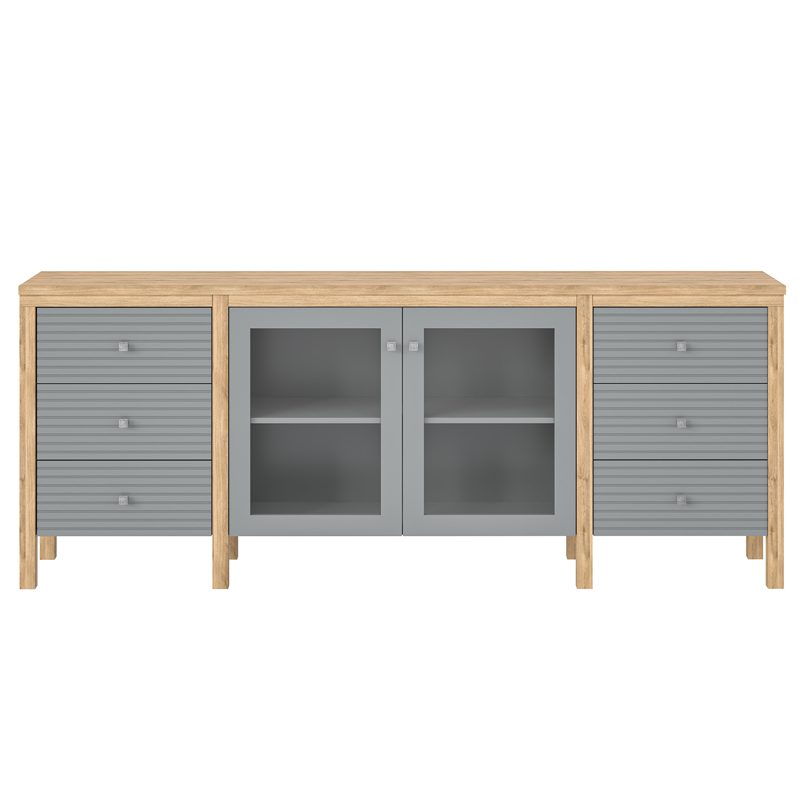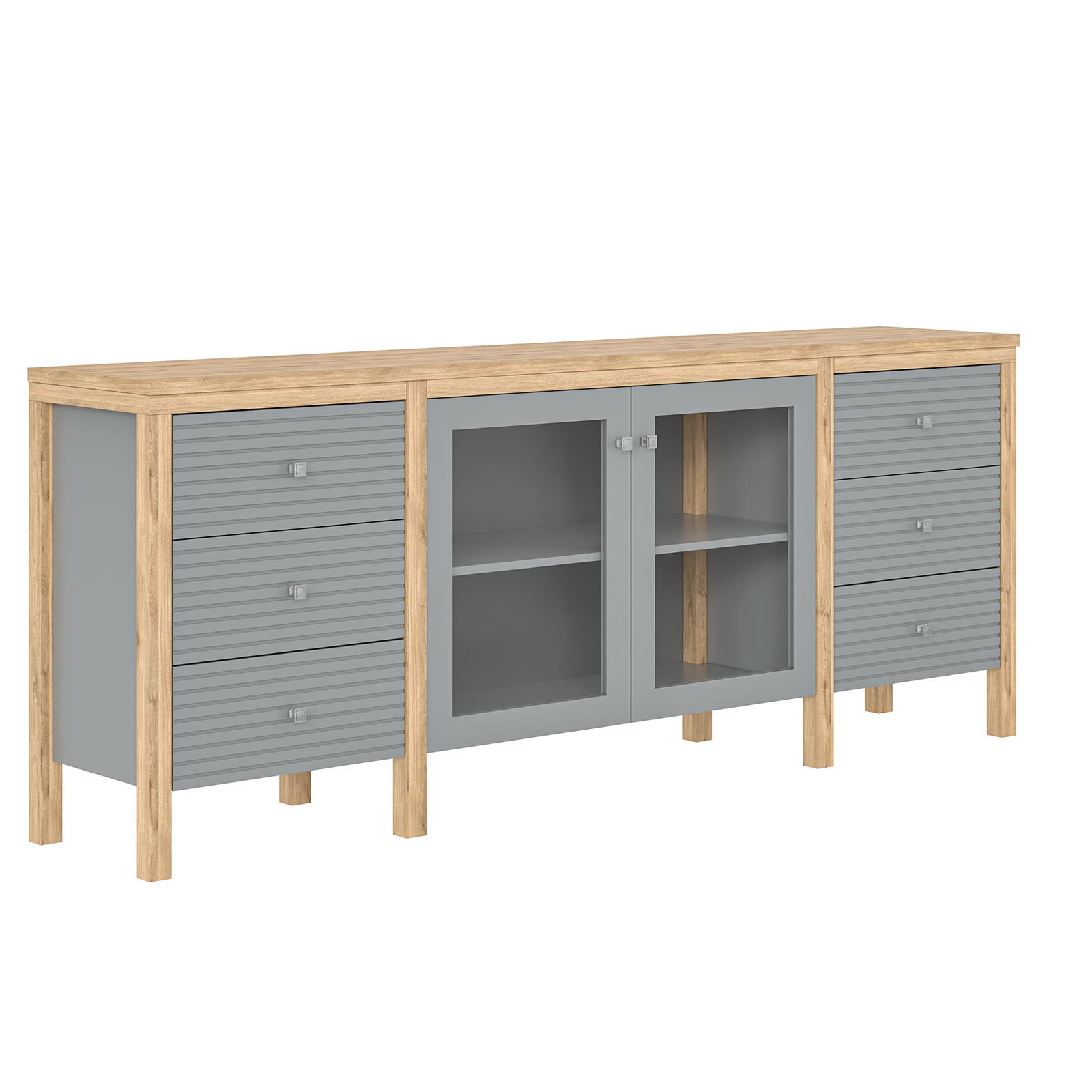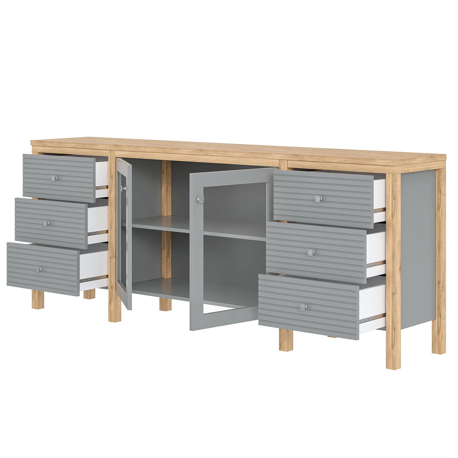 Тумба ТВ оснащена шестью выдвижными ящиками и двумя широкими полками за распашными дверями.